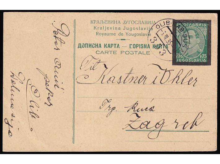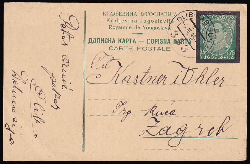• Žalobna dopisnica kraljevine Jugoslavije pisana na Olibu i upućena brodskom linijom OLIB-RAB-SUŠAK u Zagreb.