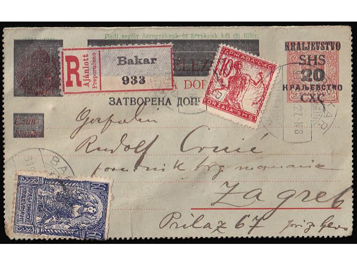 Zatvorena dopisnica dofrankirana i preporučeno upućena iz Bakra u Zagreb 27.10. 1919.