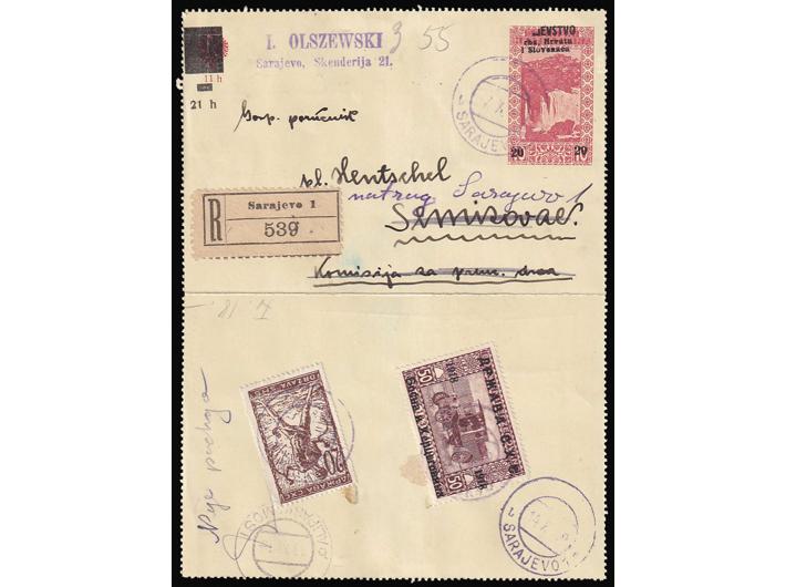 Opis: Zatvorena provizorna dopisnica dofrankirana i preporučeno upućena iz Sarajeva u Semizovac 07.10. 1919. Preadresirana i vraćena pošiljatelju preko Alipašina Mosta uz komentar „nije podigao“. Pogreška pretiska na dopisnici, nedostaje dio slova u riječi KRALJEVSTVO Srba....Odlična kvaliteta.