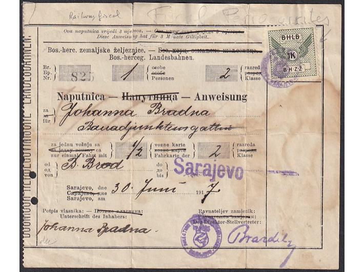 - Željeznička karta za jednu vožnju od 30.06. 1917. s vrlo zanimljivim biljegom BiH željeznice.