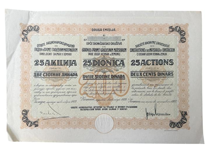 - ZEMUN, dionica "OPĆE D.D. ZA GRADNJU I PROMET GRADJEVNIM MATERIJALOM PRIJE JOSIP HEIMAN U ZEMUNU", 5 000 dinara, studeni 1922.