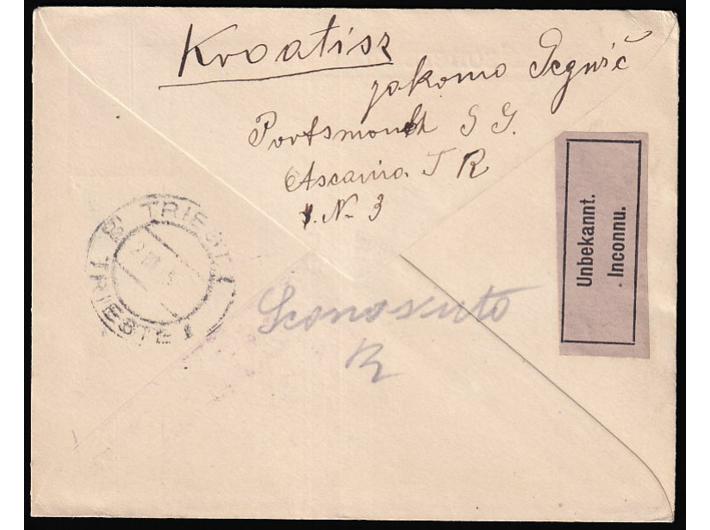 Opis: Pismo ratnog zarobljenika iz savezničkog logora upućeno u Trst. Žig logora, žig cenzure AU monarhije. Dolaz u Trst, ali primatelj nepoznat. Odlična kvaliteta.
