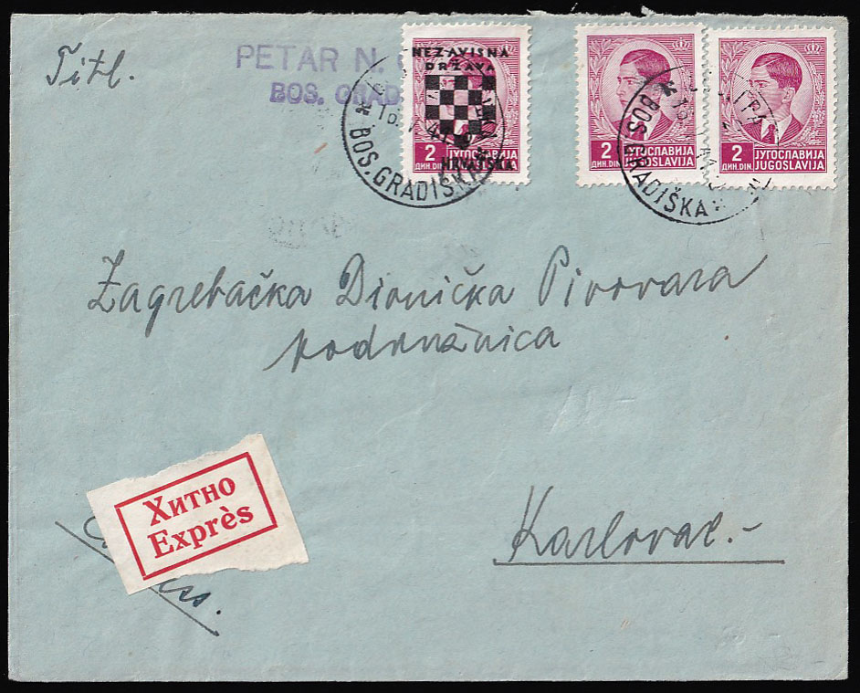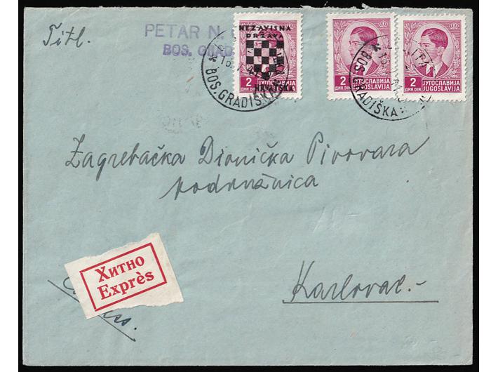 Opis: Žurno upućeno pismo iz Bosanske Gradiške u Karlovac 16.05. 1941. Mješovito frankirano markama kraljevine Jugoslavije i markom iz niza Grbače. Dolaz KARLOVAC 8 neaptirani žig. Dobra kvaliteta, rijetka frankatura.